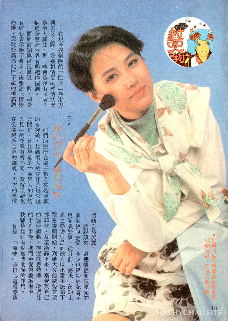 提到情,海味立即收斂了笑容,嚴肅地拒絕再提她與黎明像霧又像花的戀聞。無疑,這對雙方都有好處,尤其是對偶像派歌手而言,保持單身形象更覺重要,海味也深明此理,故眞眞假假,任君猜度,小女子絕口不提。