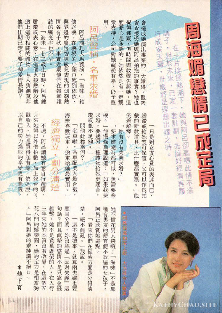 「我剛與無綫續簽了新約,賺錢機會,此其時矣,怎會輕輕放過,就此嫁人去也!」周海媚知道男友是大男人一個,婚後當然想太太留在家中照顧一切,要建立事業,過過戲癮,非在婚前完成不可。