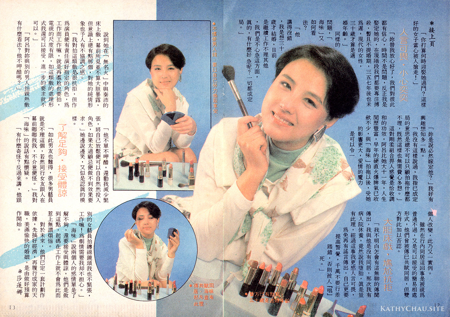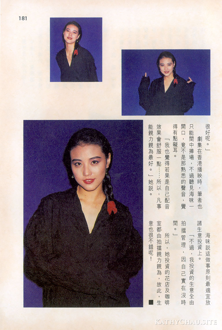 縱觀現今圈中女星或多或少都展露一點本錢,海味會否也不甘後人呢?「我最暴露那次便是參選香港小姐時所穿的泳衣,自此以後沒有再拍過任何泳裝照,因爲我根本無需這樣來宣傳自己,亦不想走性感路綫。說眞的,朋友都說我是阿婆思想,生平最怕穿上那些甩甩跌跌的衣服,好像沒穿一樣,渾身不自在!」跟海味談天,她笑的時間多於說話,名副其實的大笑姑婆,跟螢幕上那憂鬱多愁的形象截然不同,雖然她中學時期會有頗長的時間是在醫院度過,人生觀卻未因此而變得灰色,「正因爲以前多是自修,故此我盼望以後有機會重過校園生活,彌補昔日的不足。」海味邊說邊憧憬着重返校園的一天。1991年7月《明報周刊》1181期 雜誌掃圖