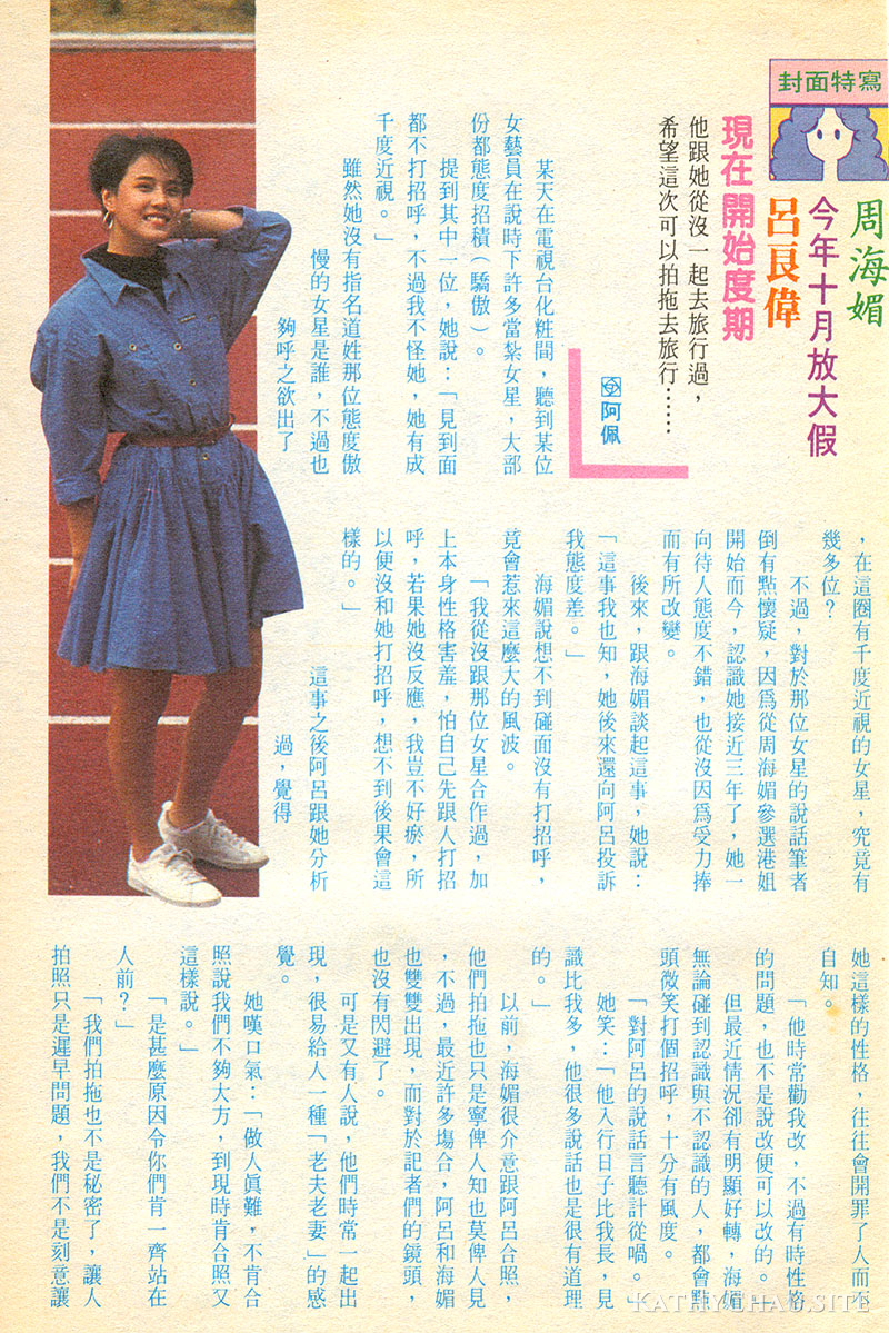 他們拍拖以來,從沒試過一齊旅行,所以海媚也希望阿呂度期成功,能陪她共渡假期。1988年8月《姊妹》357期 雜誌掃圖