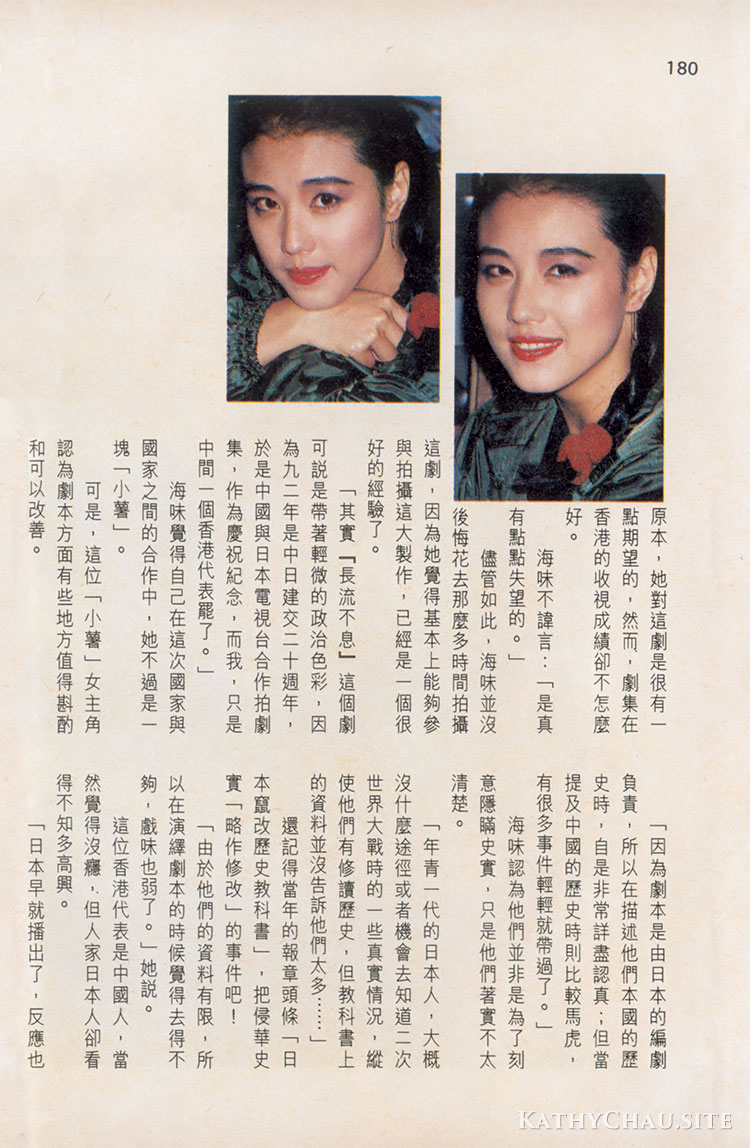 「其實『長流不息』這個劇可説是帶著輕微的政治色彩,因為九二年是中日建交二十週年,於是中國與日本電視台合作拍劇集,作為慶祝紀念,而我,只是中間一個香港代表罷了。」